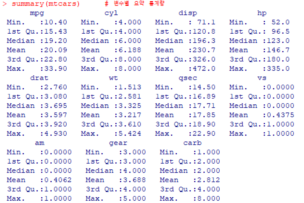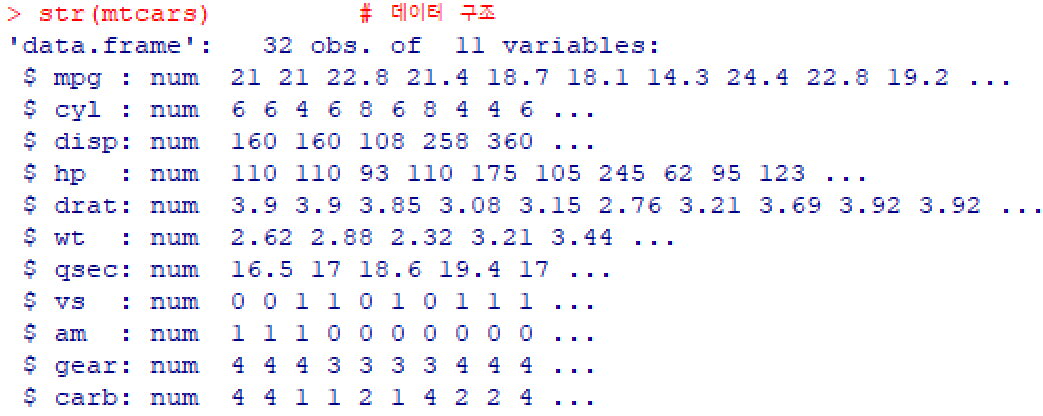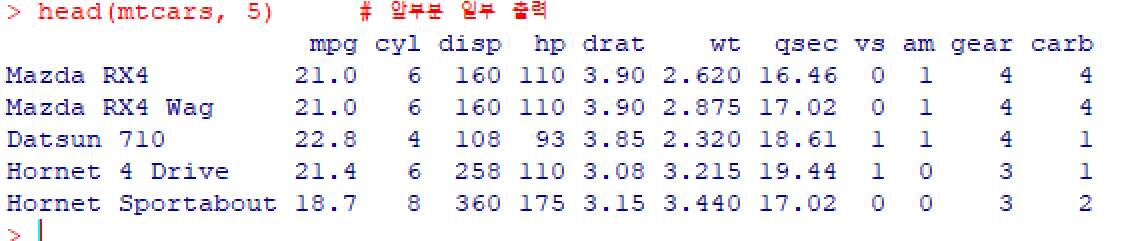 mtcars는 R 내장 데이터로, 1974년 Motor Trend 자동차 잡지에서 발췌한 32대의 자동차 데이터입니다.