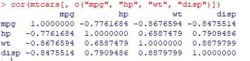 cor(mtcars[, c("mpg", "hp", "wt", "disp")])
