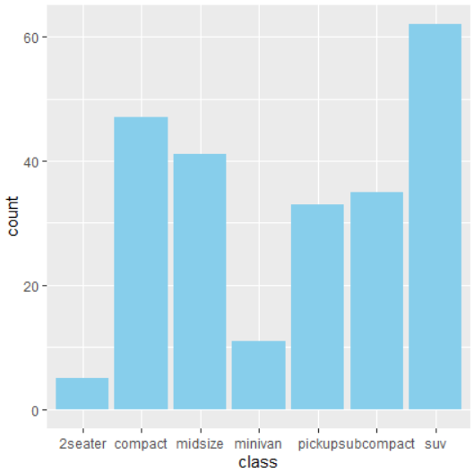 ggplot(mpg, aes(x = class)) +   geom_bar(fill = "skyblue")
