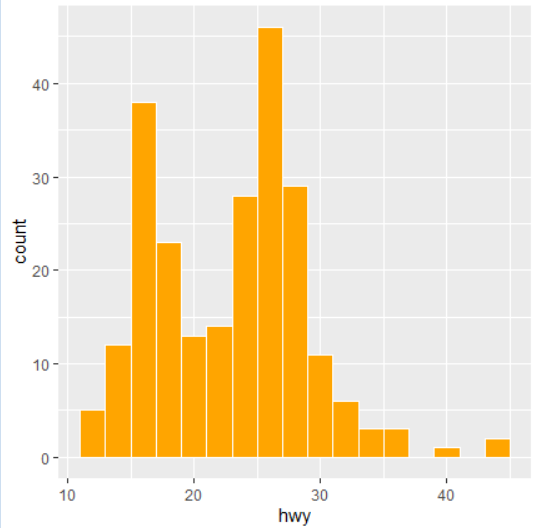 ggplot(mpg, aes(x = hwy)) +  geom_histogram(binwidth = 2, fill = "orange", color = "white")